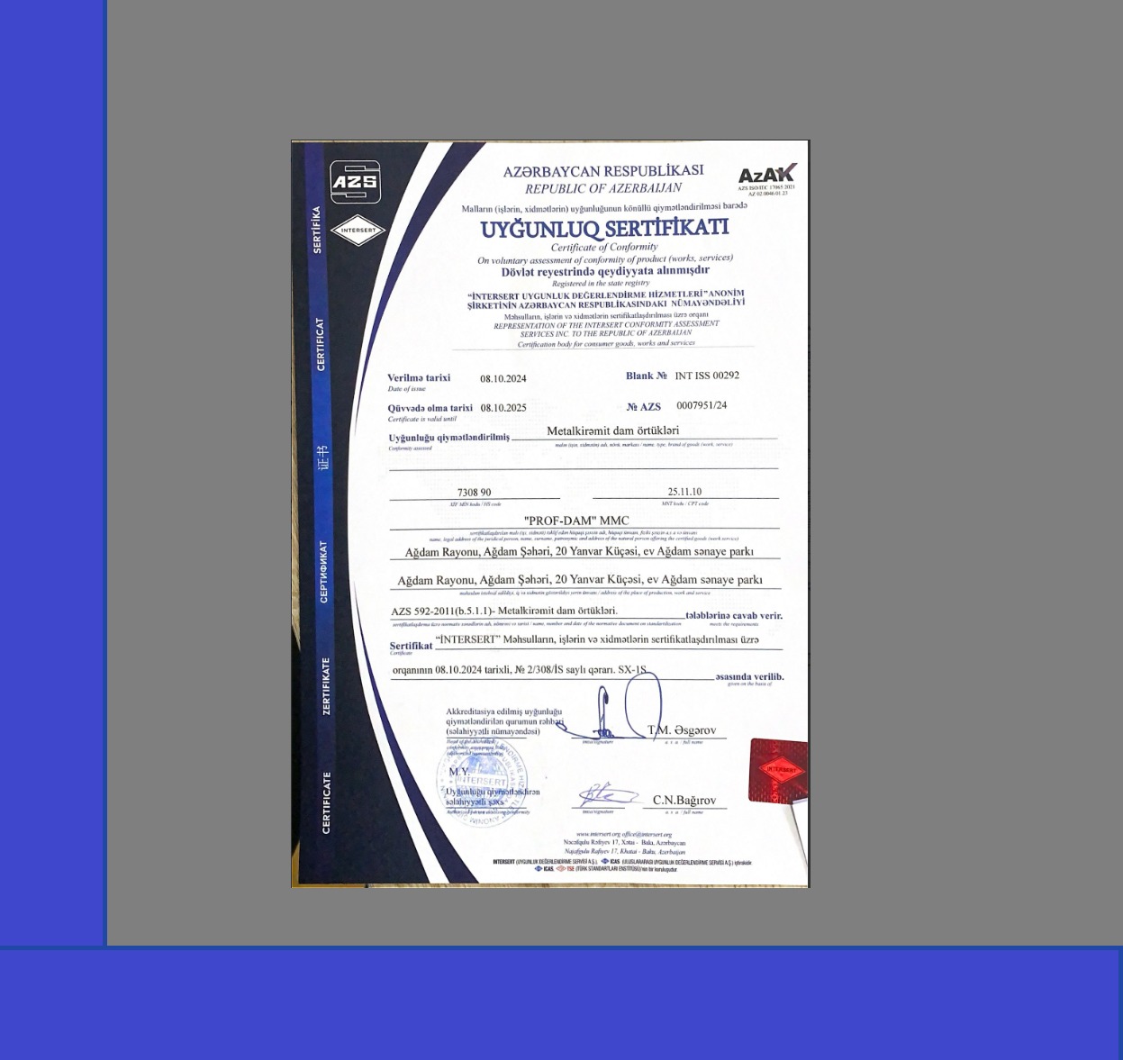 Prof-Dam MMC müxtəlif metal dam-fasad örtüklərinin istehsalı və satışının təşkili məqsədi ilə 2022-ci ildə təsis edilmişdir. 19.04.2022 tarixindən etibarən Azərbaycan Respublikasının İqtisadiyyat Nazirliyi yanında İqtisadi Zonaların İnkişafı Agentliyi tərəfindən müəssisəmizə Ağdam Sənaye Parkınınrezidenti statusu verilmişdir.